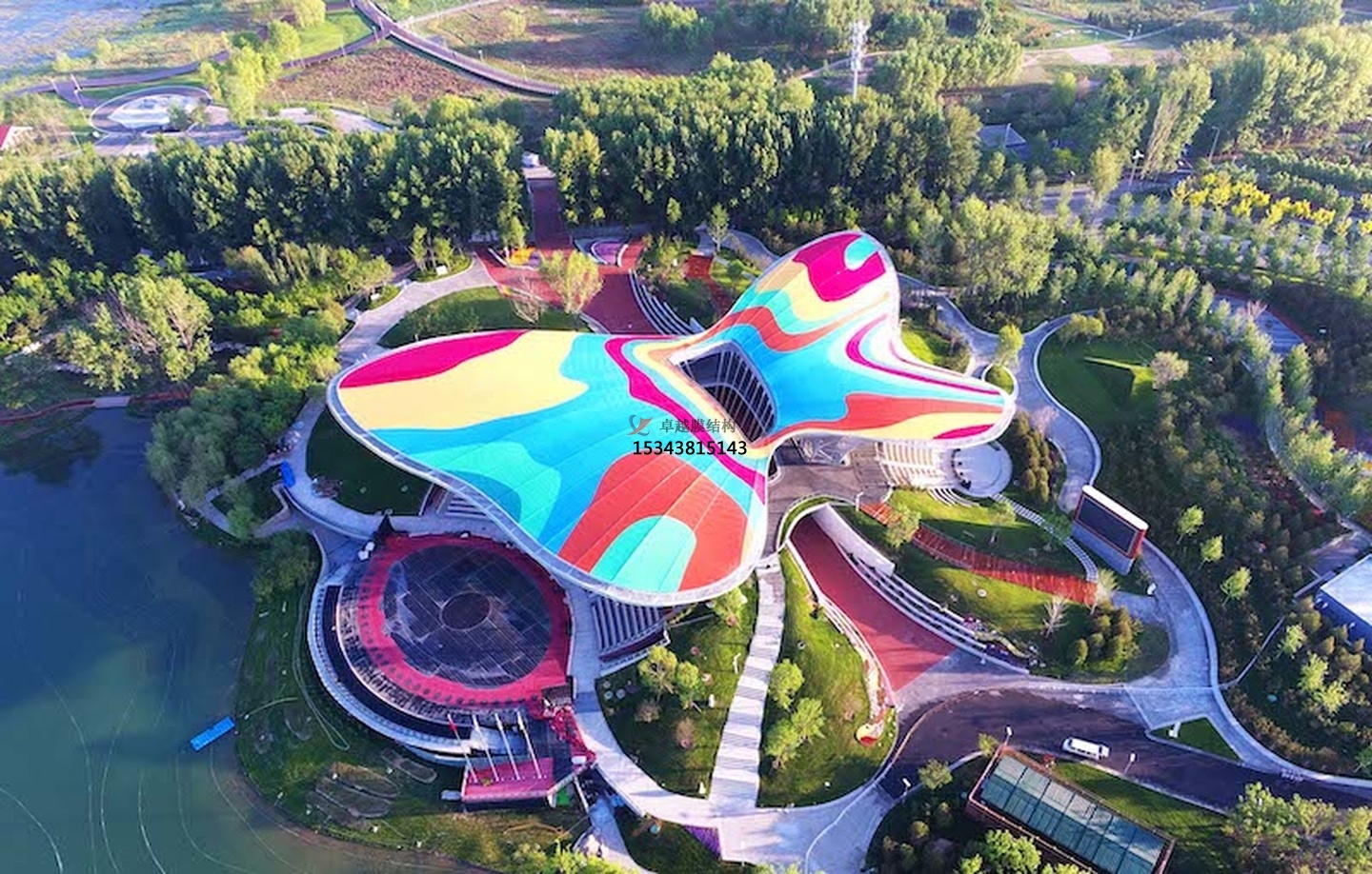 ETFE膜材除了常規(guī)的透明、藍色、白色、銀色鍍點外,其實還有五顏六色的彩色系列。今天就給大家介紹一個ETFE彩色膜應(yīng)用的經(jīng)典案例:2019的北京世園會的主場館——媯汭劇場,外觀為彩色蝴蝶造型。